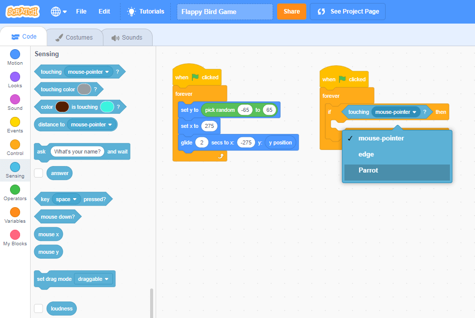 - First, make sure you click the Parrot sprite from the sprites list.