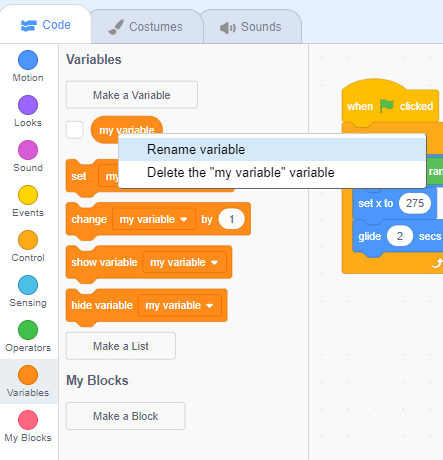 - In your Flappy Bird Project, go to the Variables category and right-click on the variable called my variable. It’s right below the Make a Variable button.