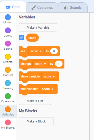 - Then, click the checkbox next to the score variable. This makes the score show up in your game.