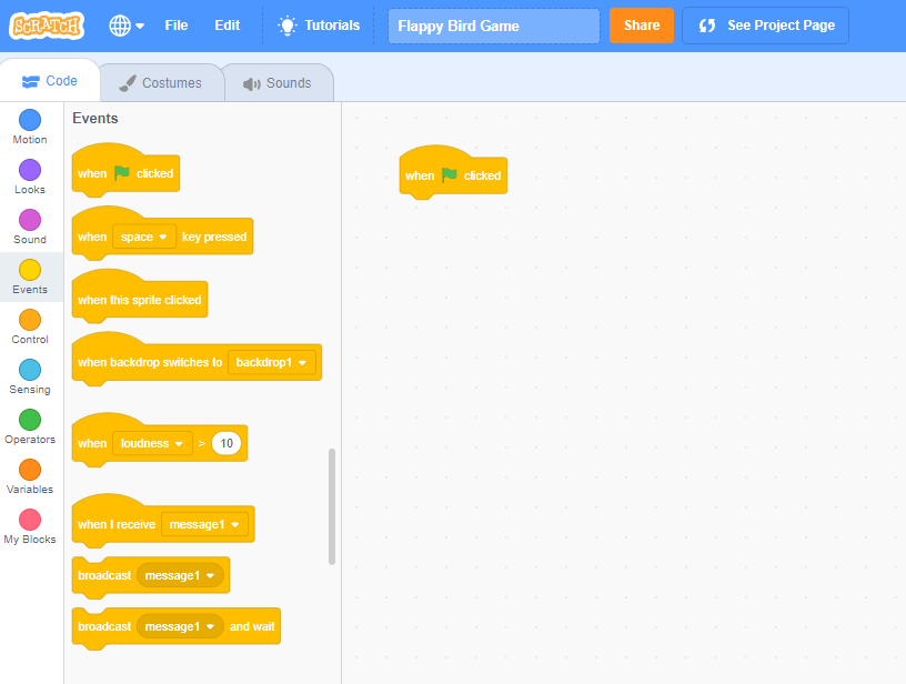 - Go to the Events category, then click and drag a when green flag clicked events block into your code area.