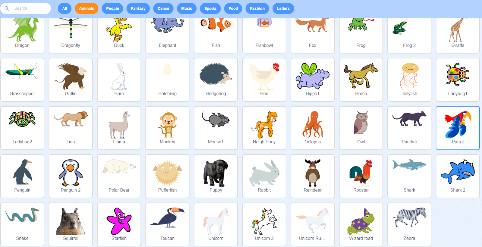 - Select a bird sprite of your choosing. We selected the Parrot sprite, which is suggested if you want to create a flapping motion for the character.